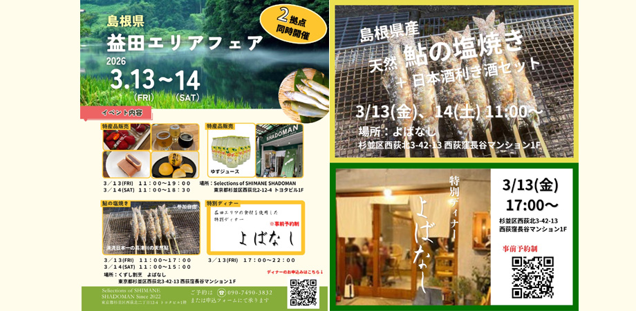 東京都西荻窪にある島根産品のセレクトショップ「SHADOMAN」と近隣の飲食店「くずし割烹 よばなし」との2拠点同時イベント「島根県益田エリアフェアin西荻窪」が開催されます。