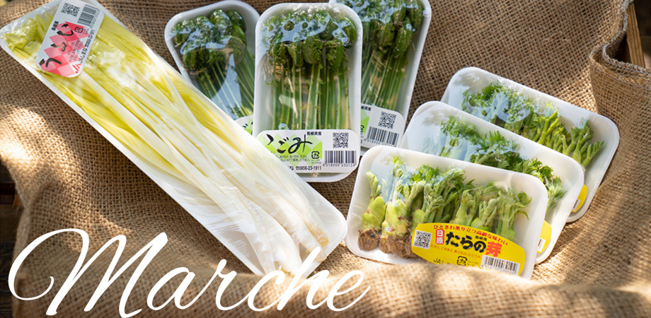 山菜(タラの芽、こごみ、うるい)、カブ、キャベツ、サツマイモ、サニーレタス、ホウレンソウ、ネギ、干し柿、杵つき餅など